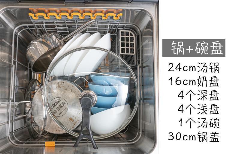 其次是锅 + 碗碟格式,咱们烹调顶用到的总计锅具王人能放得下,包括 24cm 的汤锅 +16cm 的奶锅以及 4 套的碗碟,还能再放一个 30cm 炒锅的锅盖,再别说水槽洗碗机不成洗锅了。