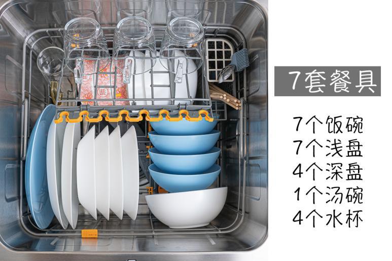 再来说说清洁体验的部分,先来说说容量,此次方太新一代水槽洗碗机 E5 的容量不错说是我最平静的部分之一。率先是通例的碗碟摆放,够 7 套碗碟的摆放,一家五口的餐具王人能放得下。