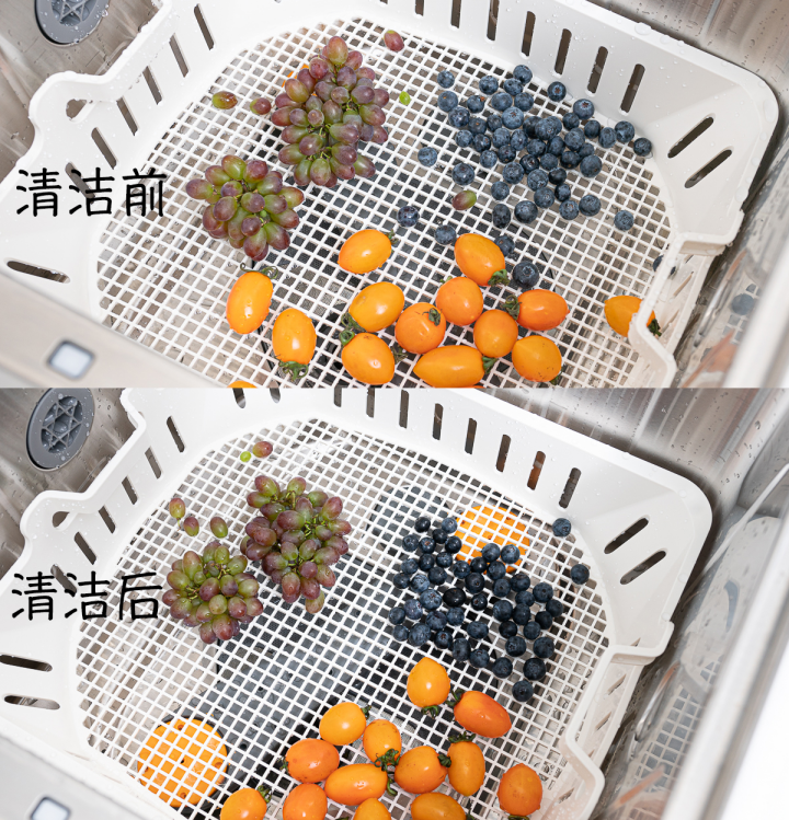 从实质的体验看,生果洗得照实很干净,从清洁前后的对比看,不管是葡萄、蓝莓名义的霜王人有一定进度的去除,表皮也莫得碎裂。小番茄名义的淤泥也清洗掉了。高能气泡洗 3.0 时间 +50000Pa 喷淋水压灵验撤销了农药残留和蔬果破绽里难洗的泥沙。