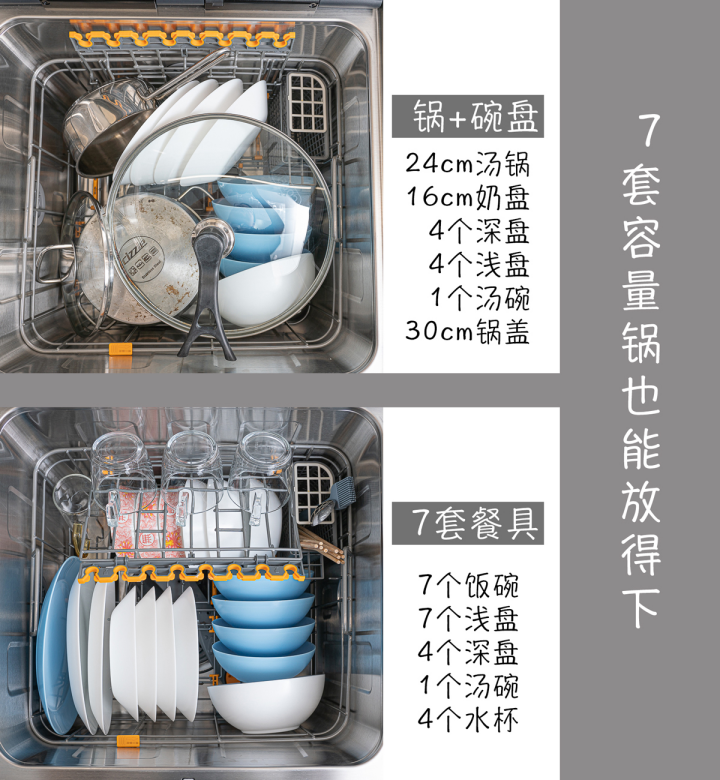 而在容量方面,亦然升级中相当实用的小数,在一样 1 米的总宽内,把容量从 6 套升级到 7 套,就怕把我本来放不下的 30L 烤箱的烤盘,以及 30cm 的炒锅放下了。不错说这个容量关于绝大部分家庭王人够用了,比拟于大洗碗机一天的脏碗筷聚一块洗一次,我更可爱水槽洗碗机一顿一洗的容貌。