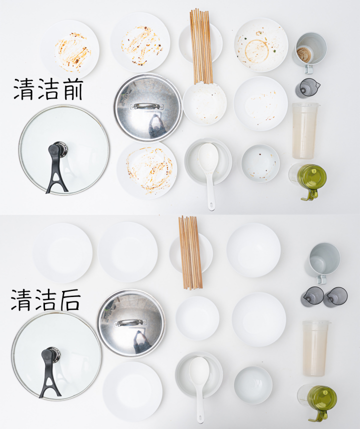 陶瓷杯上的咖啡渍,不锈钢上的油脂,塑料杯上的油脂王人能清洁干净。不仅于此,塑料杯上的陈年茶渍也能被清洁干净。不仅比手洗的干净得多,即是对比那些所谓的大牌入口洗碗机也不落下风。